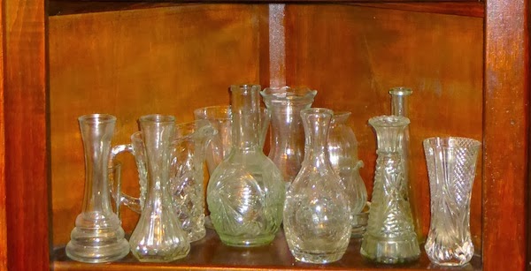 The clear glass vase collection doubles as a display on her corner shelf.